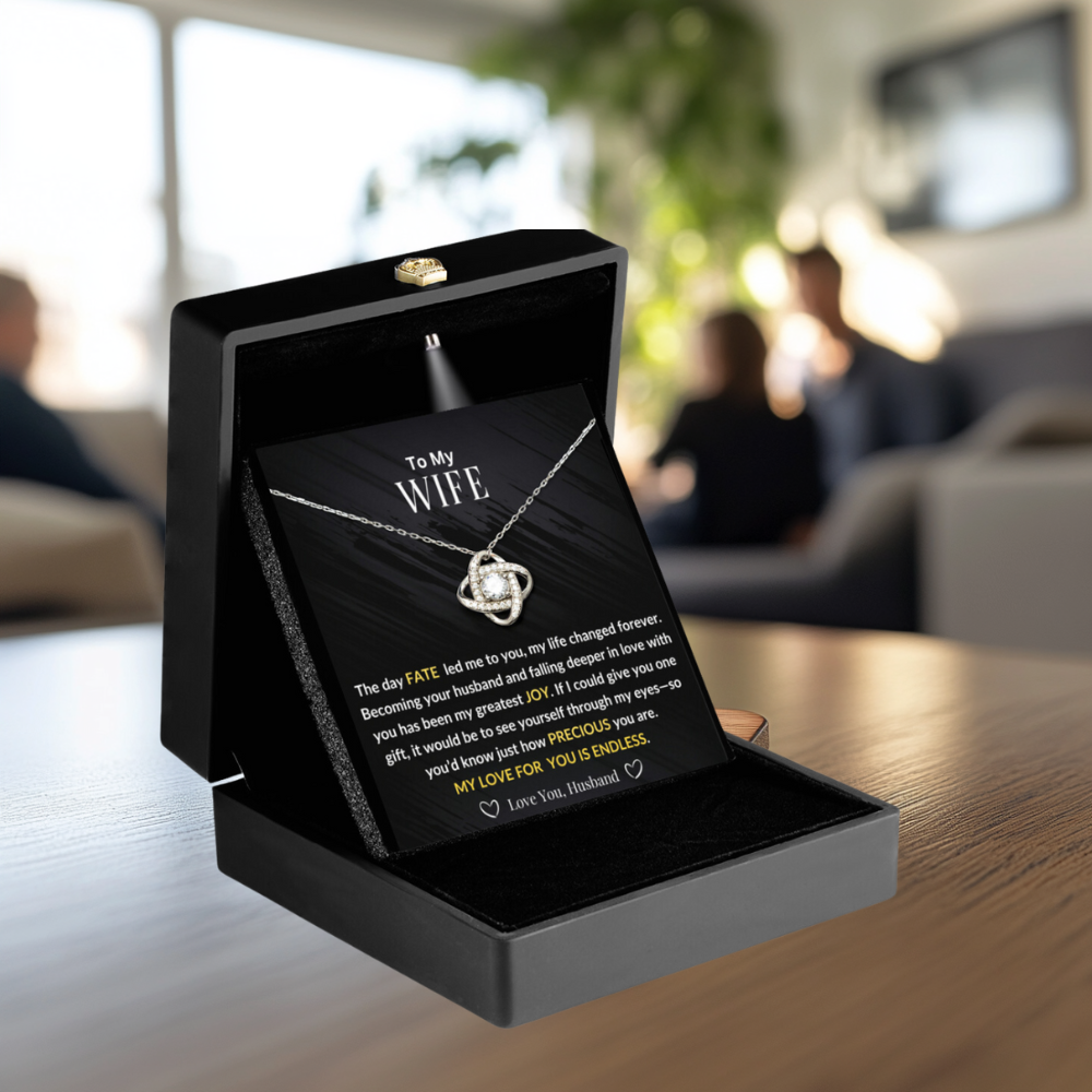 "Create a truly unique gift by customizing names and heartfelt messages. Each necklace is delivered in a luxury mahogany-style box with an LED spotlight, making it a stunning and memorable keepsake."